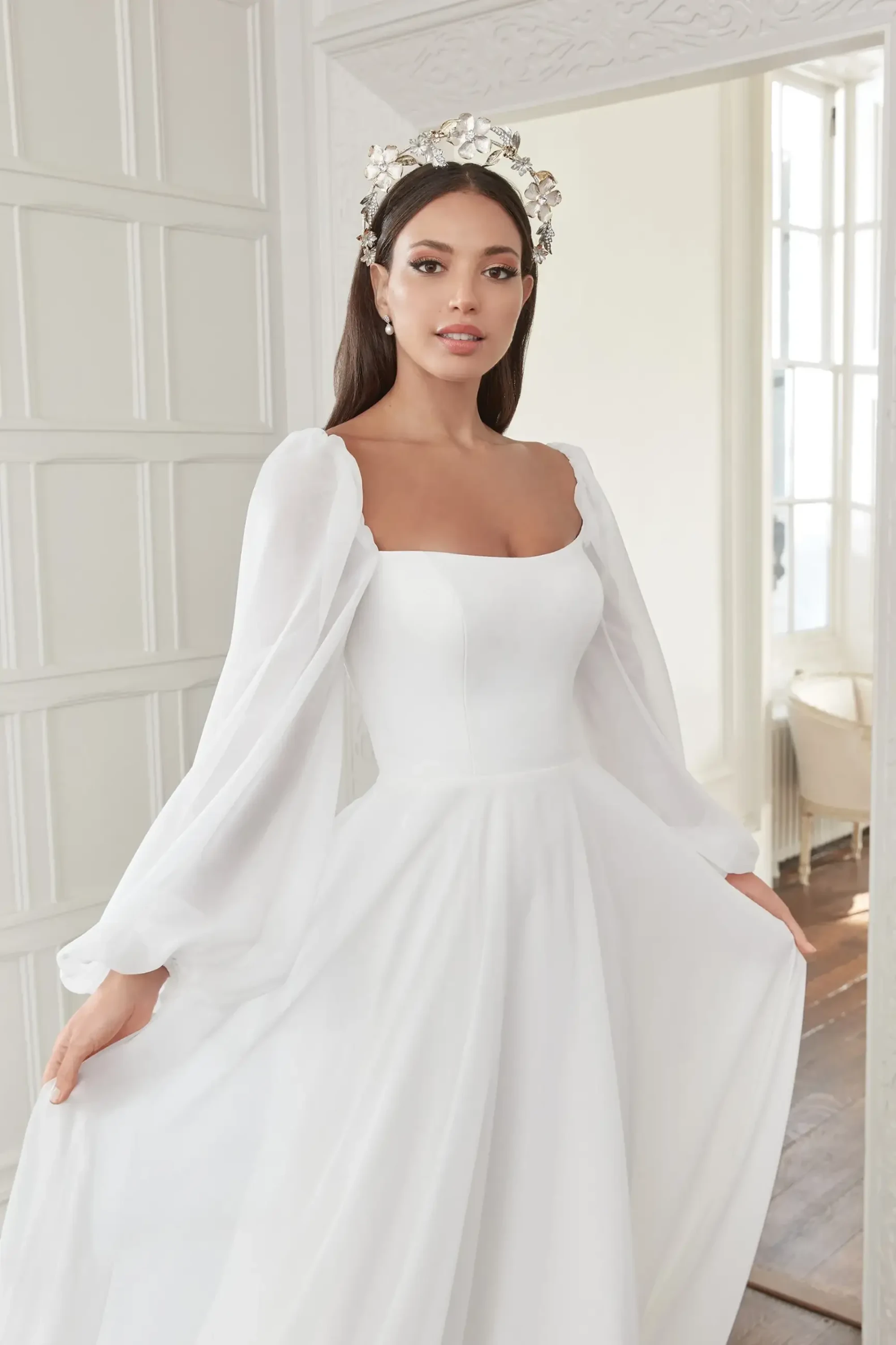 Float through your magical day in this dreamy A-line bridal gown. The style is designed with a clean crepe bodice paired with an airy chiffon skirt. The modern square neckline is enhanced with light chiffon blouson sleeves that make the gown feel irresistibly romantic. It's complete with a V-back accented with a simple chapel length train.