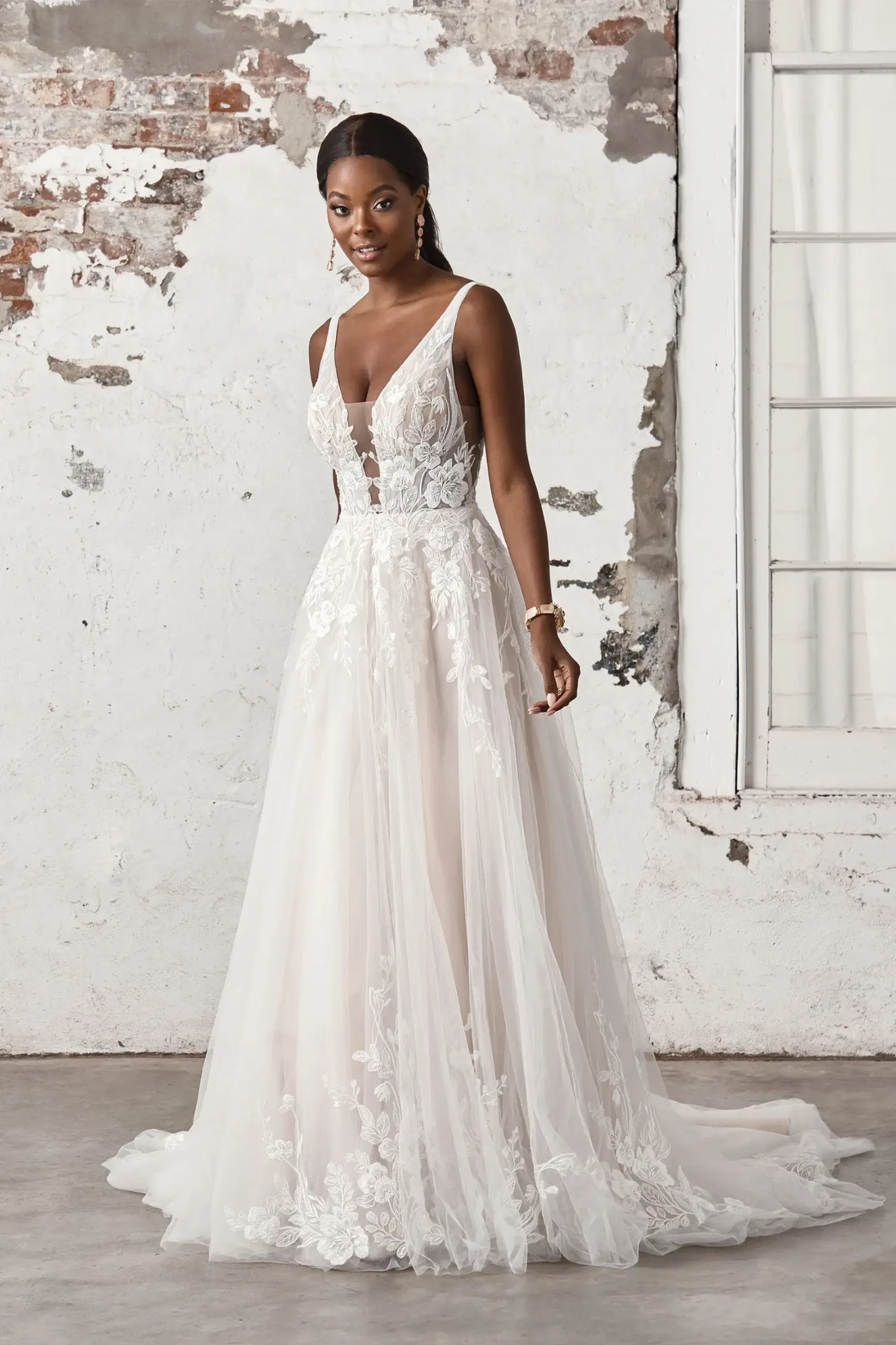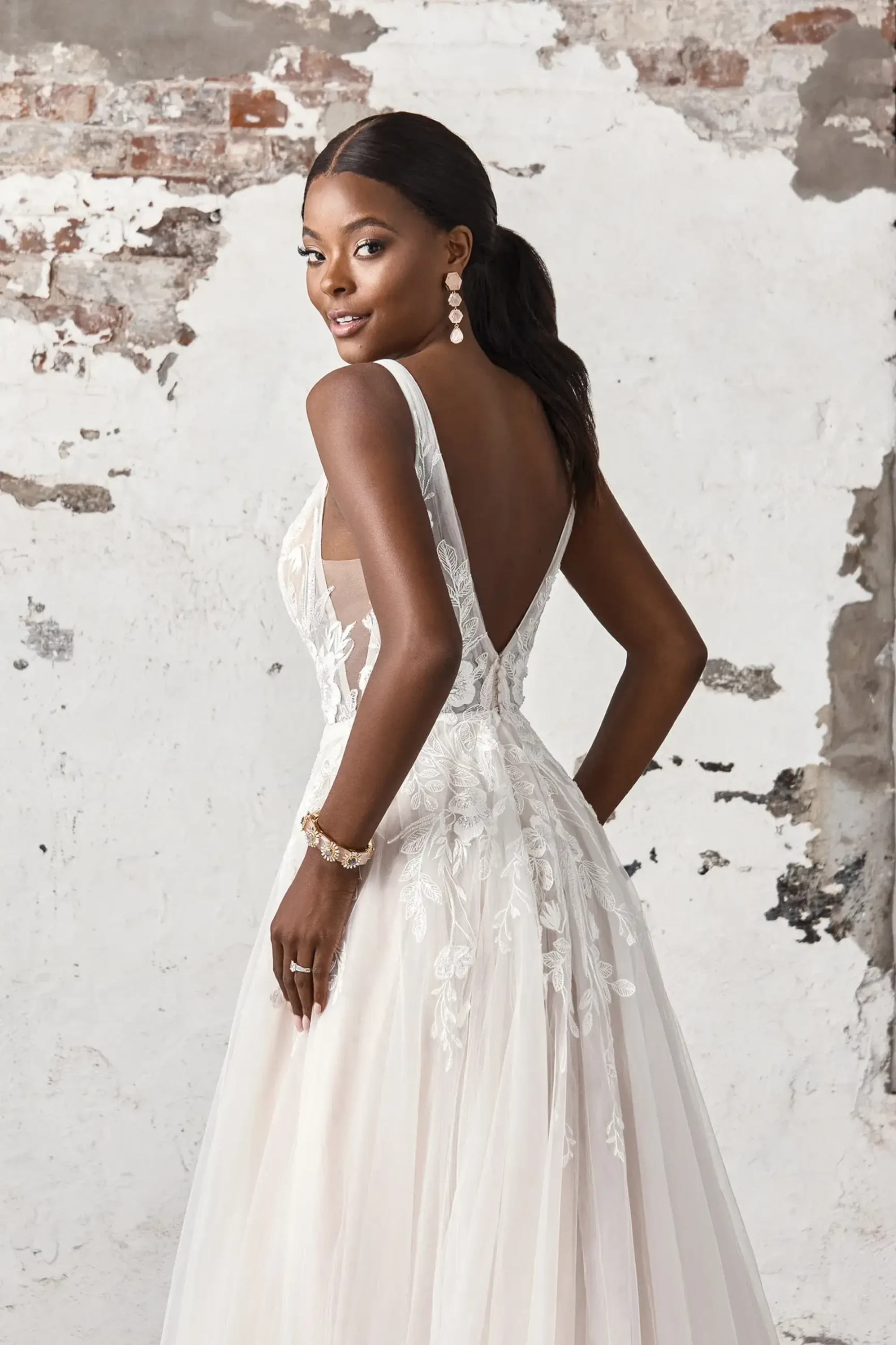A dazzling take on a classic silhouette, this slim tulle ball gown features a sexy plunging V-neckline and V-side cutouts with thin straps that give way to an open V-back. The sheer bodice is accented with softly pleated tulle adorned with beaded and sequined lace appliqués that trickle down the skirt and detail hem. The soft skirt is completed with a chapel length train and tulle covered buttons on the back bodice.